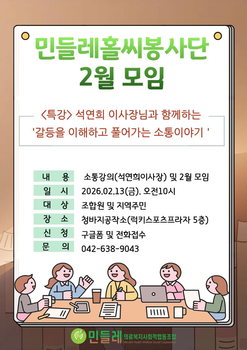 이번 모임에서는 석연희이사장님이 전하는 '갈등을 이해하고 풀어가는 소통이야기' 강의와 봉사단 2월 정기모임이 함께 진행될 예정입니다. 조합원은 물론 지역주민 누구나 참여 가능합니다.